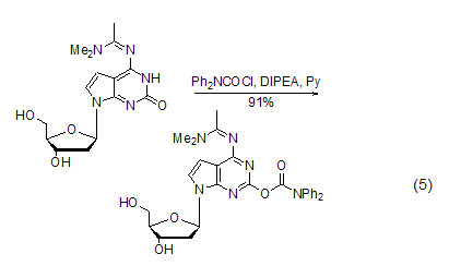 用作寡聚核苷酸合成時的保護基 在合成寡聚核苷酸時,鳥嘌呤核苷的堿基容易發(fā)生副反應,需要加以保護,dpc-cl可以將鳥嘌呤堿基的烯醇異構(gòu)體酰基化而對其進行保護,這種方法在合成具有鳥嘌呤堿基和與鳥嘌呤堿基類似的核苷化合物時[9~12],發(fā)揮著重要作用 (式5)。